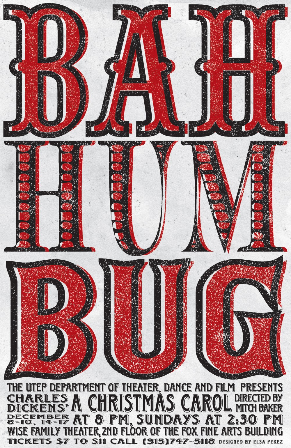 The UTEP Department of Theater, Dance and Film provided our class with a project for their production of A Christmas Carol. My design proposal was highly based on my first memory of this movie. What stuck with me the most was the use of the phrase “Bah Humbug!” To me as a child didn’t mean anything in particular, but from the context I could tell it wasn’t a good thing to say, especially during the holidays. The phrase can’t be said without someone thinking about Ebenezer Scrooge, so I figured using it on a poster around the holidays would be a great way to get people’s attention. The typography and the styling were heavily influenced by victorian era posters, characteristic of the time period in which the story takes place.