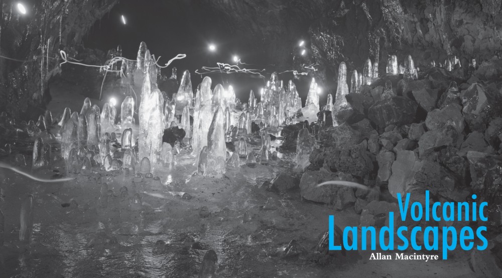 This publication was created to compliment Allan Macintyre’s Volcanic Landscapes exhibit at the Rubin Center. His show combined the artists own black and white photos of various volcanic areas around the world, as well as illustrations inspired by them. I mainly focused on the contrast between his black and whites and his brightly colored drawings to design a way to display his work in a catalog. I decided to stick to using colors swatched from his illustrations on all the backgrounds and titles to emphasize the contrast between both of his creations.